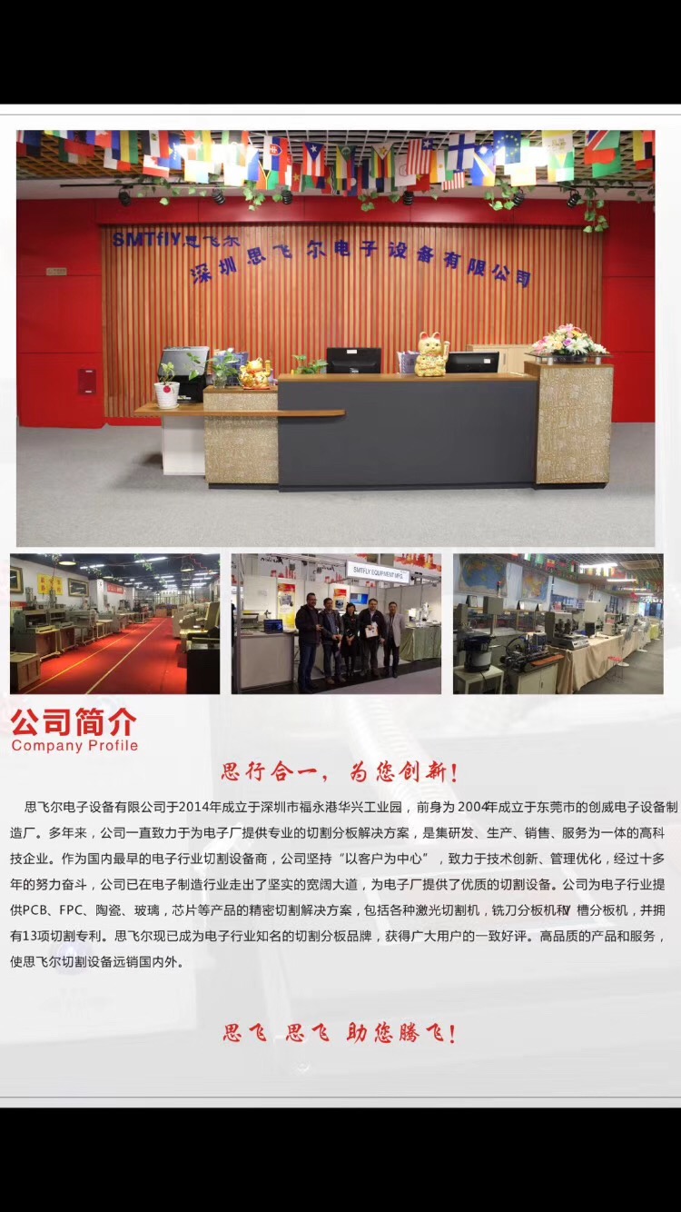 深圳思飛爾電子設(shè)備有限公司是一家專(zhuān)業(yè)致力于自動(dòng)化設(shè)備開(kāi)發(fā)、生產(chǎn)、銷(xiāo)售于一體的公司,具有多年開(kāi)發(fā)、生產(chǎn)經(jīng)驗(yàn)和雄厚的技術(shù)力量及生產(chǎn)能力。擁有長(zhǎng)期致力于自動(dòng)化控制及編程的技術(shù)人員和銷(xiāo)售團(tuán)隊(duì),開(kāi)發(fā)有各種自主品牌自動(dòng)化設(shè)備項(xiàng)目。自主品牌設(shè)備有激光切割機(jī),FPC激光分板機(jī),PCB激光切割機(jī),陶瓷激光切割機(jī),等設(shè)備。功能齊全,性價(jià)比高,幫助電子廠又好又快制造產(chǎn)品歡迎垂詢、洽談。